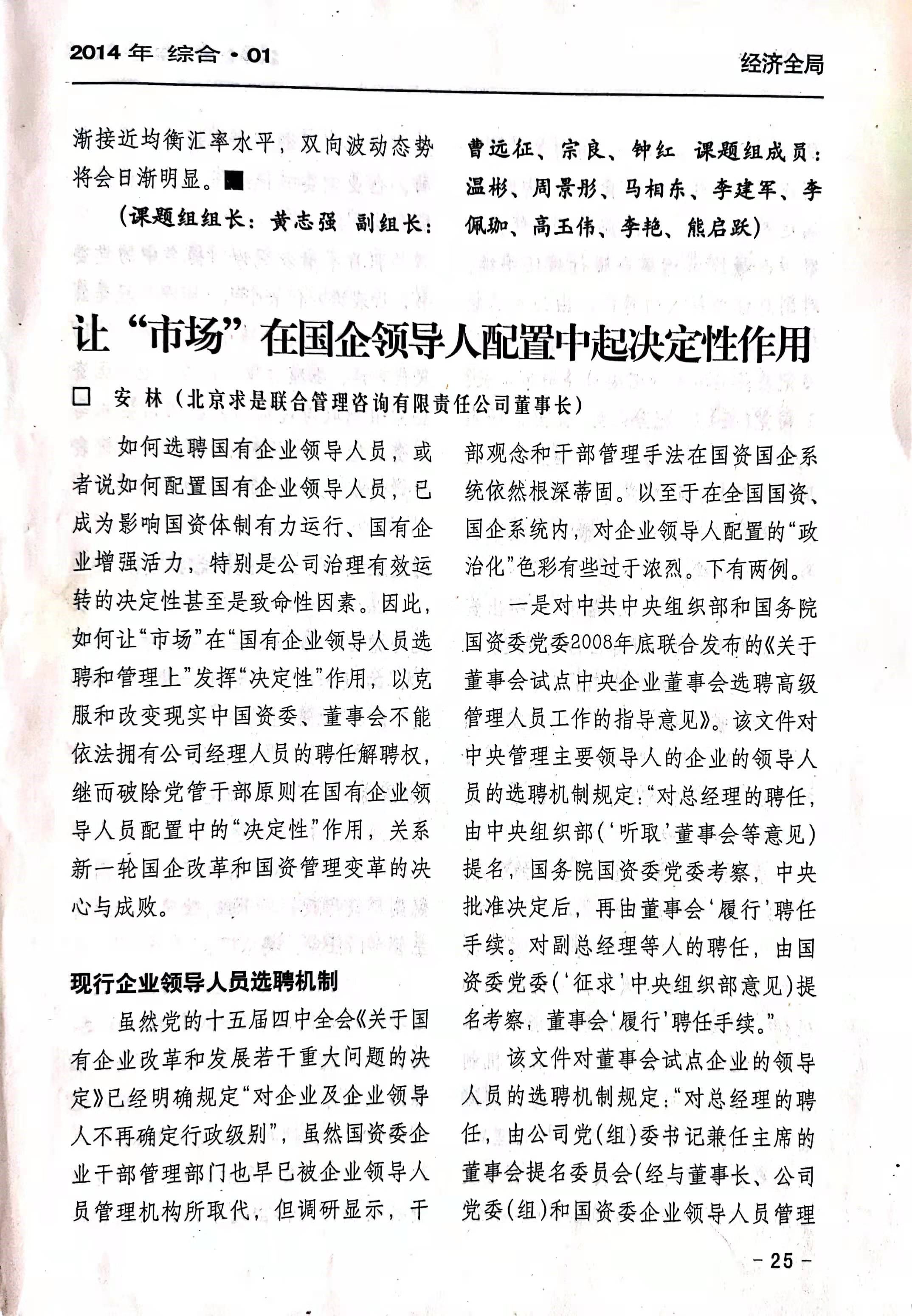 2014年1月,求是咨詢董事長(zhǎng)、《改革內(nèi)參》特約研究員安林博士特邀在《改革內(nèi)參》(綜合01/24)發(fā)表了一篇重要文章:《讓“市場(chǎng)”在國(guó)企領(lǐng)導(dǎo)人配置中起決定性作用》。文中通過研究大膽提出“讓董事會(huì)差額選聘經(jīng)理人”的改革主張。后又通過建言和提案等形式積極向上反映。
